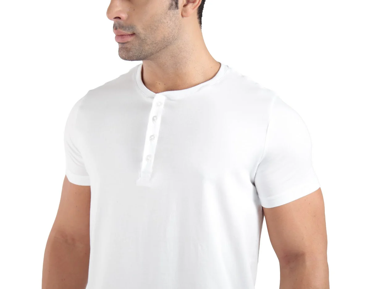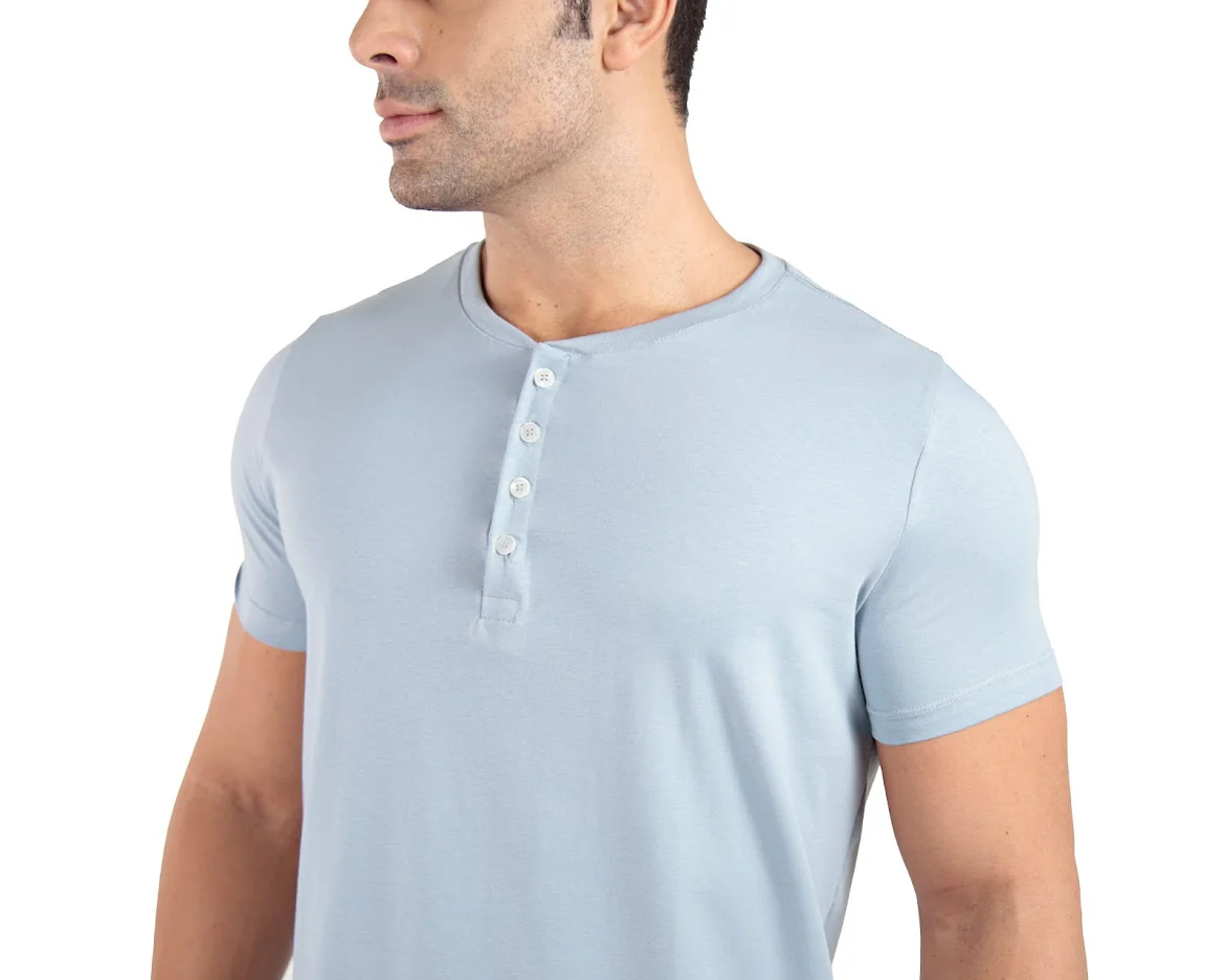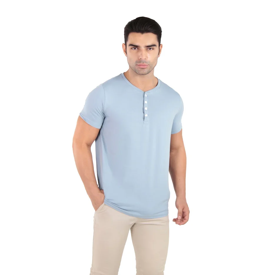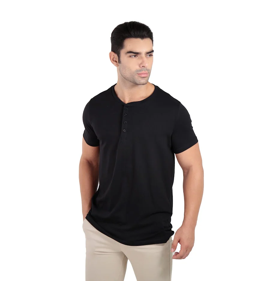 Os modelos de camiseta Henley possuem botões frontais que garantem um visual mais alinhado a uma peça casual.